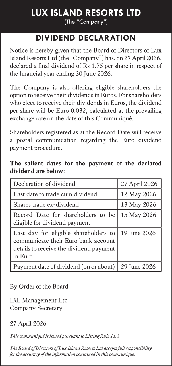 The dividend remains declared in MUR, with the EURO option made available in accordance with the terms set out in the issuer’s communiqué (click herein).